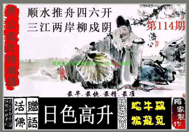 114期:济公特码诗:顺水推舟四六开,三江两岸柳戍阴(开:兔39)解:顺水推舟四六开,三江两岸柳戍阴,解肖蛇牛鸡猴龙兔 九肖:蛇虎牛狗兔羊鼠猴鸡 六肖:蛇虎牛狗兔羊
